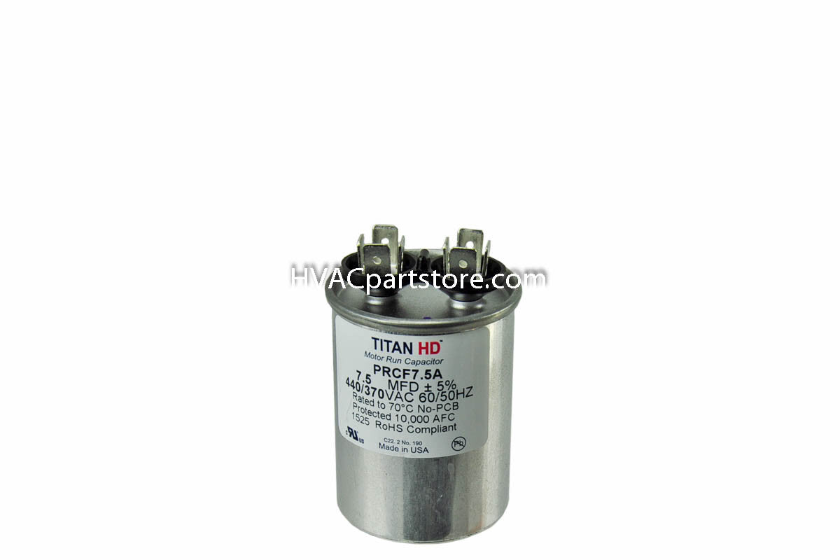 Heavy duty round-shaped run capacitor holds electrical charge to help start motor. 7.5 MFD, 370 or 440 Volts. Replaces 12105, 12805, PRC7-5A, TRC7.5, TRCF7.5,