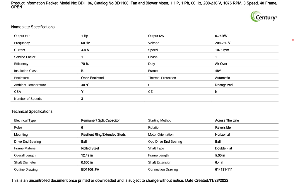 Motor weighs 21 pounds!! Also known as part number S1-02427667000 and Genteq F48L05A48. 02427667000 Century motor BD1106